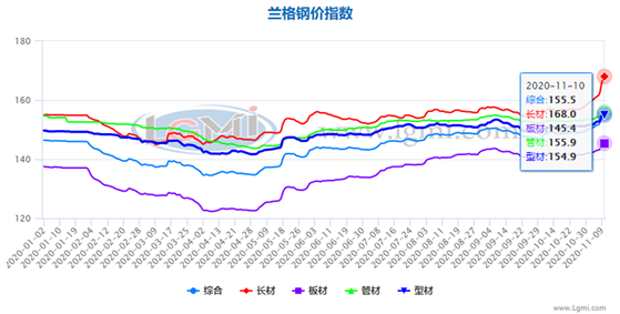 2020年,中国钢材市场价格先抑后扬,宽幅震荡扬升。据兰格钢铁网市场监测数据,2020年11月10日,全国钢材价格综合指数为155.5点,比去年同期上涨7.08%。其中长材指数上涨5.98%,板材指数上涨10.31%。与今年初相比,全国钢材价格综合指数上涨6.21%。其中长材指数上涨8.45%,板材指数上涨5.75%。总体来看,全国钢材价格指数重心有所上移。
