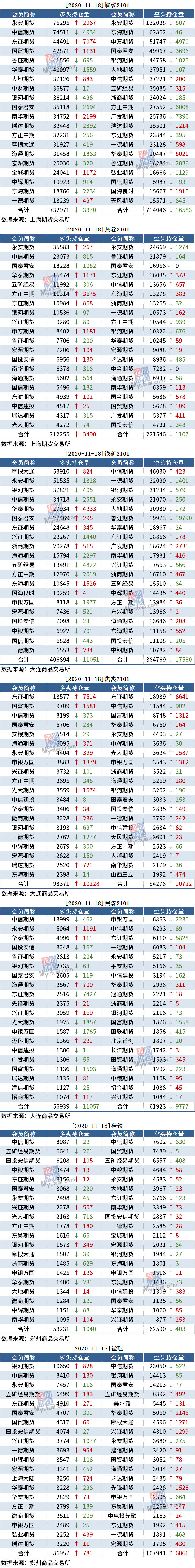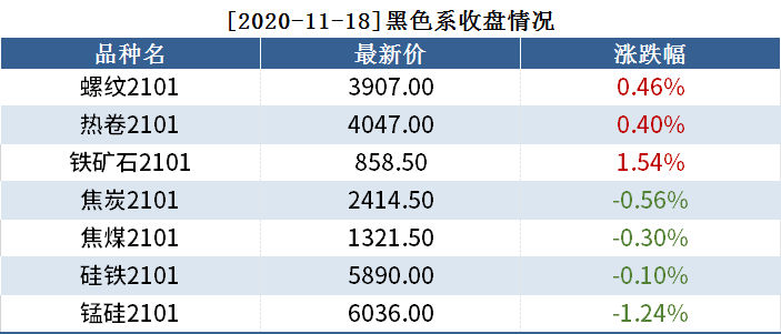截至11月18日收盘,螺纹2101收3907,涨0.46%;热卷(4047, 16.00, 0.40%)2101收4047,涨0.40%;铁矿(859, 13.00, 1.54%)石2101收858.5,涨1.54%。各品种具体如下: