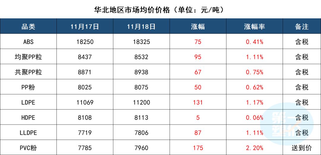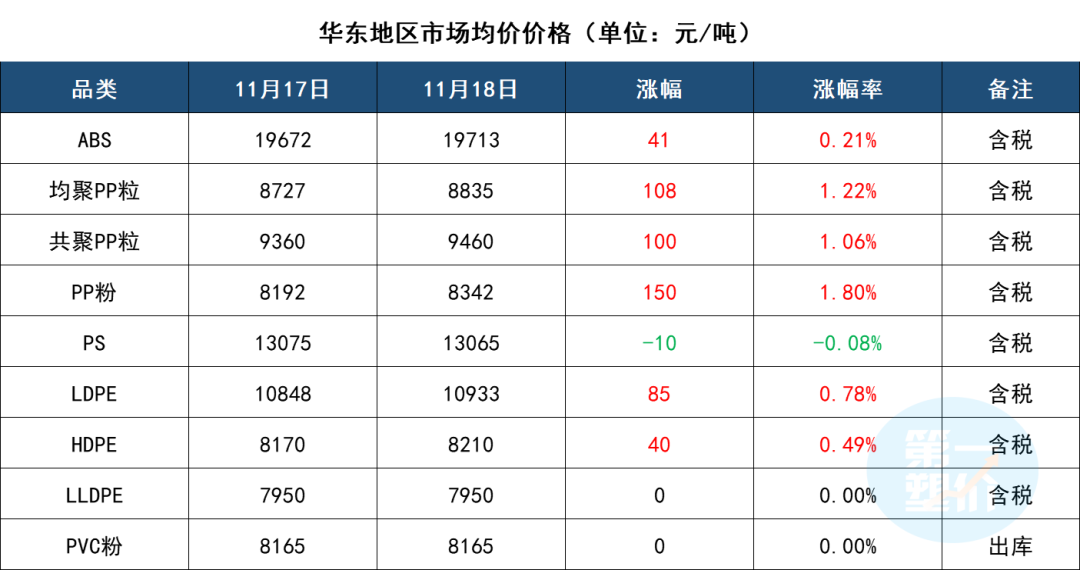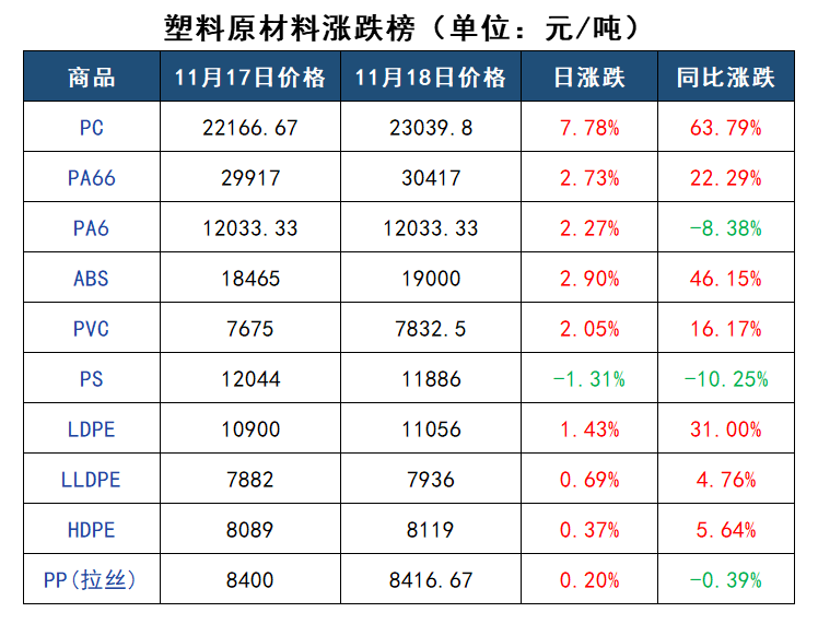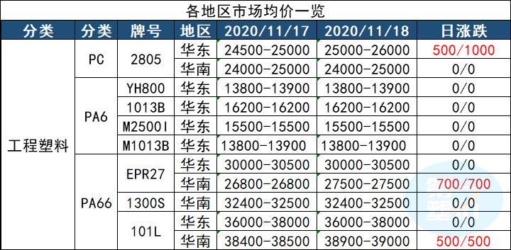 今日现货市场价格涨跌互现,ABS涨100-500元/吨,PS涨跌互现,涨50-300元/吨,个别跌50-100元/吨,PC涨200-600元/吨,个别涨1000元/吨,PE、PP普涨50-500元/吨,PE最高涨1100元,PP最高涨850-1100元/吨,PA6上涨200-700吨,PA66涨500-1000元/吨!