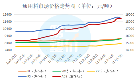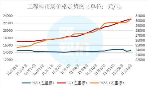 PC的涨价历程一直是这样的,最近5天上涨9.78%,10天上涨17.30%,20天上涨21.70%,30天上涨25.92%,60天上涨41.51%。11月18日市场均价23040元/吨,与8月初相比上涨63%,妥妥的橡塑涨跌榜第一名。