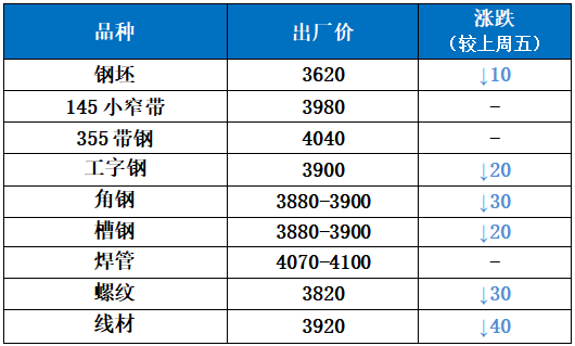 11月23日唐山钢坯直发价格报3620元/吨,较上周五降10元/吨,仓储现货含税报3640-3645元/吨,整体成交一般,唐山小窄带出厂价稳,盘中降40元/吨。唐山型材价格趋弱调整,成交冷淡,唐山地区建材市场价格整体降20-40元,期螺大幅跳水,市场成交低迷。