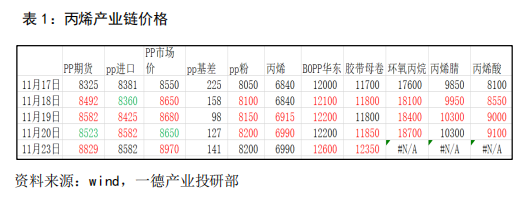 PP国内现货价格跟随盘面上涨,且丙烯链条价格重心都在上移,包括上游(丙烯)-中游(粒料以及环氧丙烷、丙烯腈、丙烯酸、丁辛醇等)-下游产品(BOPP、胶带母卷)。