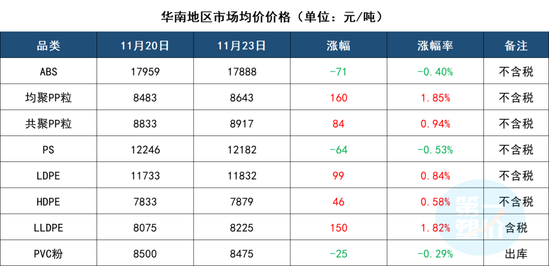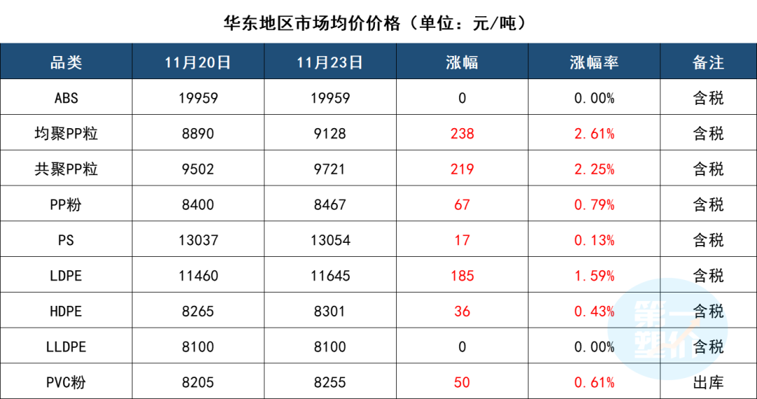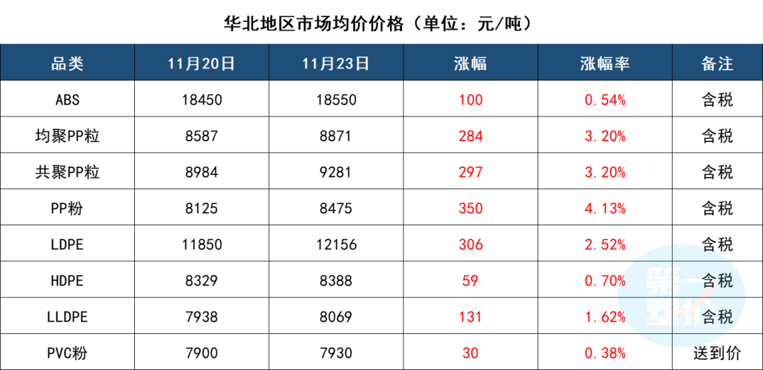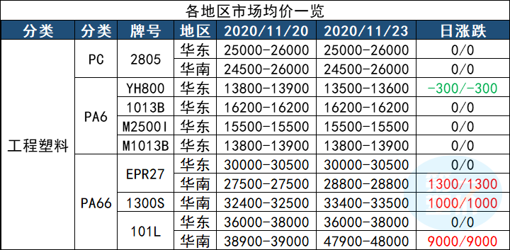 今日市场价格涨跌互现,ABS涨100-200元/吨,跌100-300元/吨,最高跌110元;PS延续弱势,跌50-350元/吨,个别涨100-600元/吨,PC个别跌100-350元/吨,涨100-1000元/吨,PE、PP普涨100-600元/吨,PE高压最高涨1100-1600元/吨,PA66大涨500-1300吨,101L单日涨9000元/吨!
