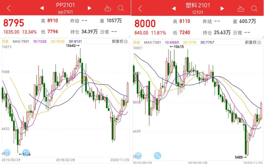 塑料期货也不甘落后,百家齐放。PP期货继续上涨,有望冲至年内最高,3月30日PP期货跌至最低5711元/吨,截止到昨日收盘已经冲破8800元/吨至8824元/吨,价差达到3113元/吨,振幅54.5%;PVC期货连续大涨,盘中创2年多新高。截至10:04,PVC期货主力合约涨0.55%,盘中最高触及7495元/吨,创2018年8月17日以来新高;PE期货从11月初7265元/吨,昨日收盘已经冲至8000元/吨,价差达735元/吨,看到这样的涨势,真的离历史性时刻不远了!