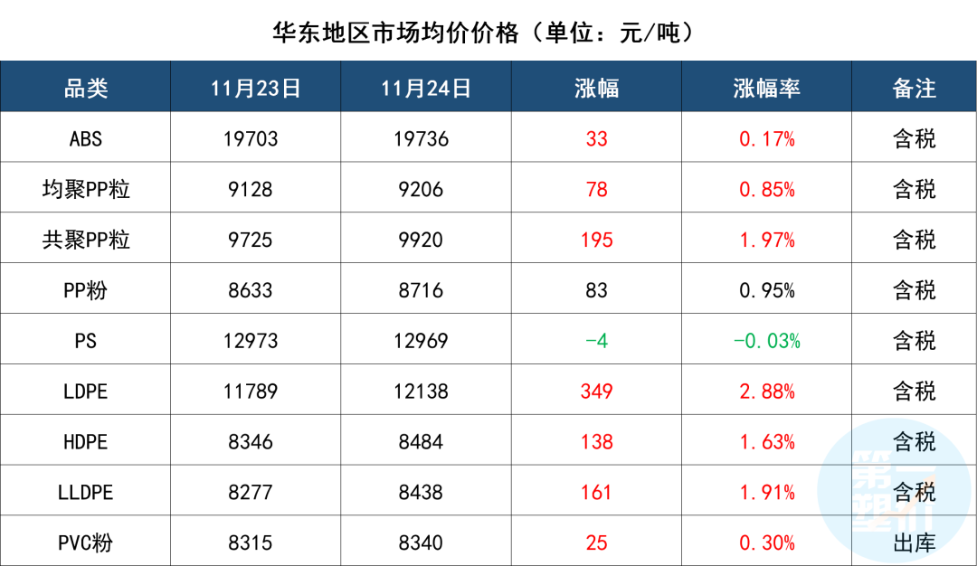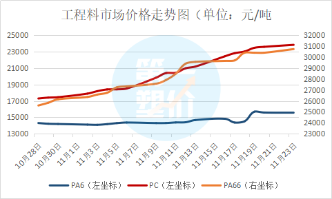 而现货市场在期货及供需等因素影响下,市场涨势更是动力十足,大有突破之前年内高点之势头。截止目前以华南聚丙烯为例,拉丝主流在9100-9200元/吨,共聚主流在9400-9650元/吨,华南PP拉丝价格较10月上涨约1000元/吨,涨幅达12.4%。共聚上涨1200-1300元/吨,PE高压料昨日价格部分牌号已涨至13400元/吨,更不用说涨势更加迅猛的ABS、PC及PA66了。目前市场所有目光都在紧盯这波行情,在货源紧以及经济内需恢复较好,下游订单充足,再加上资金在期货市场的拉动,价格不想涨都比较难吧。下面一起看下今天市场行情吧~