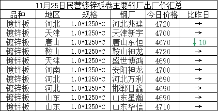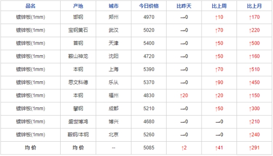 今日国内涂镀价格暂稳运行。热卷黑色系期货震荡运行,原料现货价格弱稳,今日北方民营钢厂镀锌价(20710, -210.00, -1.00%)格部分降10元,其中代表钢厂:兆建4720元/吨、新宇4700元/吨、东恒4670元/吨。据贸易商反馈,市场部分商家心态略有松动,无花镀锌的价格依旧坚挺,有花镀锌价格部分下调。临近月底,国营钢厂结算即将出台,多数贸易商预估本月结算高位已定,当前价格难以下调,商家多出货回笼资金为主。南方市场上海地区近期部分钢厂资源有所到货,市场缺货情况有所缓解。综合来看,预计明日国内涂镀价格或盘整运行。