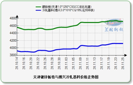 天津镀锌板卷与博兴冷轧基料价格走势图:
