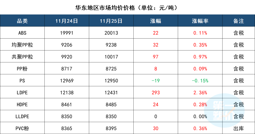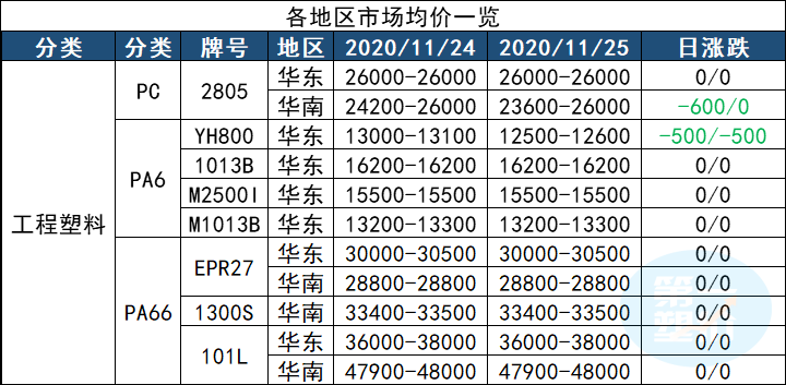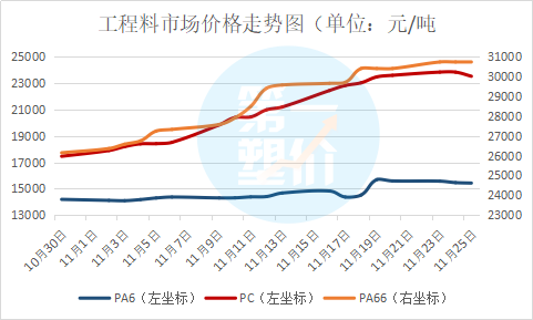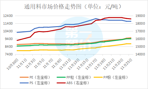 十一月中下旬国内ABS行情延续强势运行,截止11月24日,通用级ABS主流报盘价在19500元/吨左右,较月初均价水平有11.43%的涨幅,近期现货价格出现高位调整。现对当前PC市场环节与要素进行梳理,为后市的判断提供一定参考。
