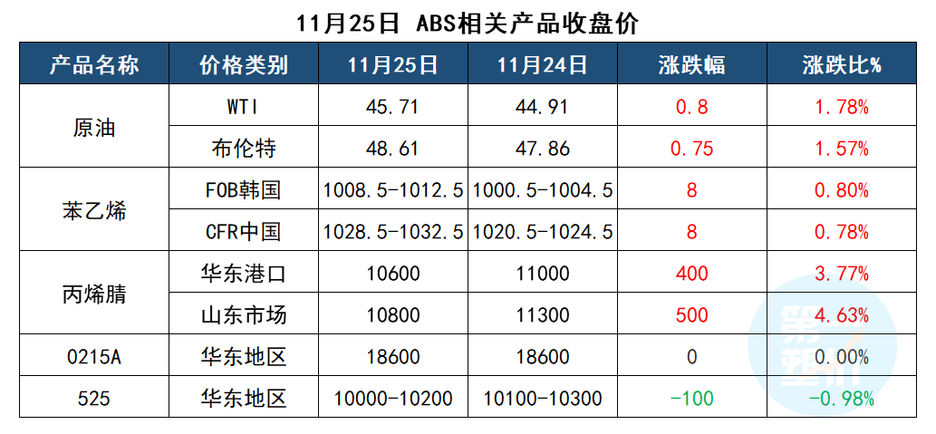 近期随着RCEP签署、疫苗研发、大宗商品共振等陆续被市场消化,ABS实际跟涨吃力。近期ABS市场行情高位整理,各牌号价格涨跌互现。随着交投的阻力,商家放缓跟涨报盘,但场内货源流通紧张,ABS基本面相对稳固,国内ABS价格重心尚且稳定。