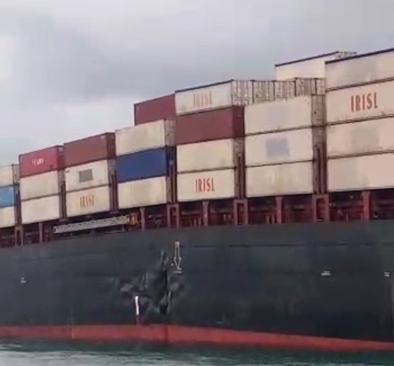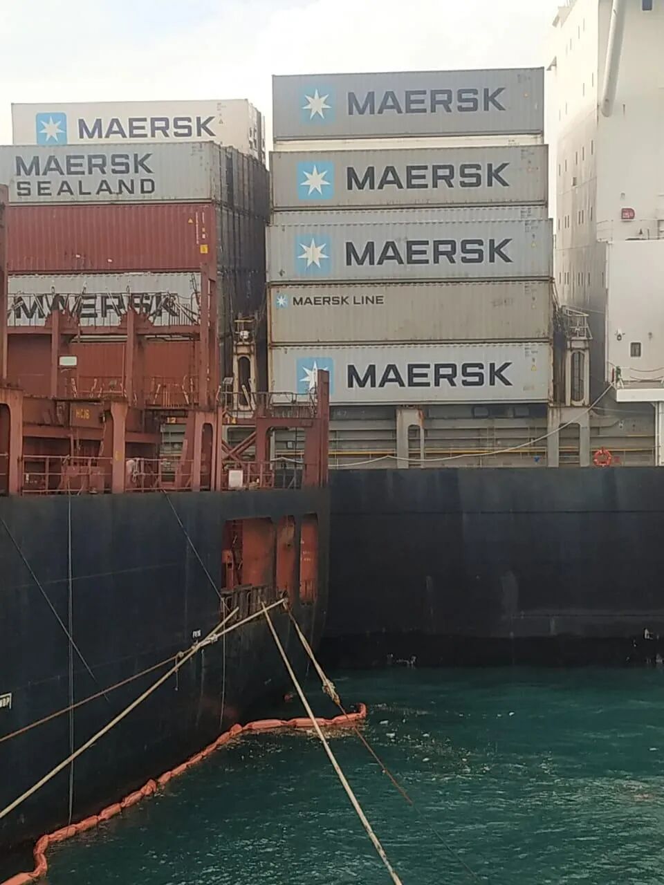 据悉,这艘已搁浅被“撞”的伊朗“Shahraz”号货船是一艘运力为6572TEU的集装箱船,也是于今年5月在此发生撞船事故后而一直搁浅,船体遭到严重破坏,船舷垂直开裂。早些时候,新加坡打捞团队被伊朗伊斯兰共和国船主任命,“Shahraz”号的货物将由该公司卸载。