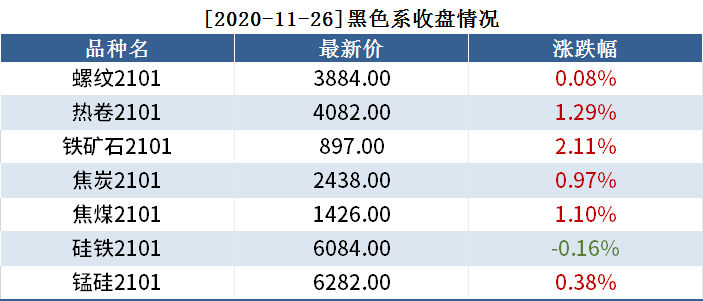 截至11月26日收盘,螺纹2101收3884,涨0.08%;热卷(4082, 52.00, 1.29%)2101收4082,涨1.29%;铁矿(897, 18.50, 2.11%)石2101收897,涨2.11%。各品种具体如下:
