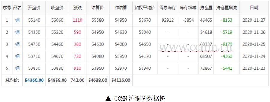 11月27日当周,国内现货铜价走势强劲。长江有色金属网1#铜均价报54826元/吨,日均上涨490元/吨,周线上涨4.61%;此前一周均价报53148元/吨,与上周相比上涨1678元/吨,环比上涨3.16%。