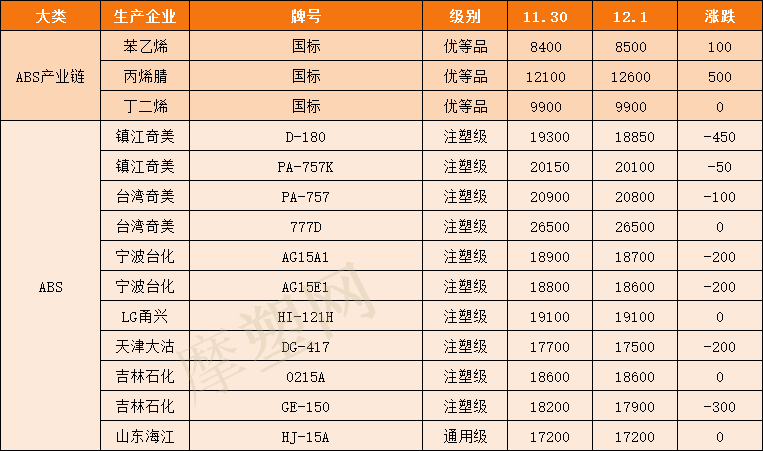 摩塑网交易平台成交情况,ABS市场价格主要表现为继续走低。市场中厂家报价部分下调;上游苯乙烯、丙烯腈价格继续上调,然下游需求一般,商家出货承压,成交难以放量,报价继续走低;平台上产品价格随市场变化。根据摩塑网平台成交数据显示,预计ABS今日市场价格应会是偏弱整理!