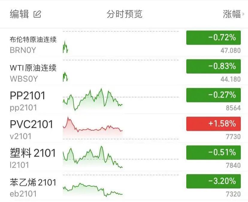 期货市场也没好到哪里,前期涨的多疯狂,现在跌的多厉害。之前一度认为PP期货主力合约能突破8900元/吨,结果不到一周的时间,现在已经跌破8500,一直被看好的苯乙烯2101也跌到7300元/吨左右,据专业人士分析,预计期货方面还会小幅调整!