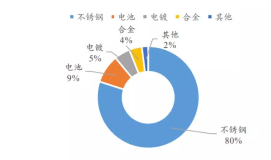 在近代工业中,镍主要用来生产不锈钢,在 2019 年原生镍消费结构中,80%镍用于不锈钢;而电池、电镀和合金分别占比 9%、5%、4%,未来不锈钢将会保持 3-5%稳定增长,由于近年来新能源汽车行业的兴起将拉动电池对镍的需求。UBS曾在报告中写到当新能源汽车市场占比达6%时,镍的需求达16.7万吨;当新能源汽车市场占有率达10%,镍的需求达40万吨,可能将导致全球优质镍供应紧张。