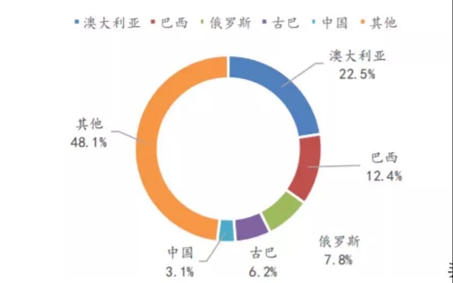 全球镍资源丰富,分布于世界各地,储量整体呈现上涨态势。根据美国地质调查局(USGS)数据,全球镍资源储量 8900万吨,其中澳大利亚为镍资源最丰富的国家,占比 22.5%;其次是巴西 12.4%、俄罗斯 7.8%、古巴 6.2%、中国 3.1%等,前五大国家的镍储量占比共达 51.9%,镍资源储量分布相对集中。