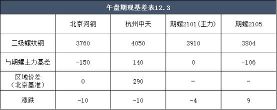 期货部分:3日,螺纹期货2101合约夜盘开盘3910,夜盘低位震荡,日盘到来后维持震荡运行态势,午收跌4,最高3917最低3881,减仓2.8万余手,2105合约开盘3812,最高3820最低3782,涨9,增仓近1.5万手,热卷(4237, -1.00, -0.02%)夜盘整体高开低走,日盘到来后维持低位运行态势,开盘4267,午收4231跌7,最高4269最低4208,减仓1.7万余手,原料焦炭(2536, -10.50, -0.41%)夜盘高走势和热卷类似,夜盘开盘2570.0,午收2544.0,跌2.5,最高2586.5最低2522.0,铁矿(933, 11.50, 1.25%)石夜盘平稳运行,日盘到来后维持高位震荡运行态势,开盘934.0,午收933.0涨11.5,最高940.0,最低921.5。