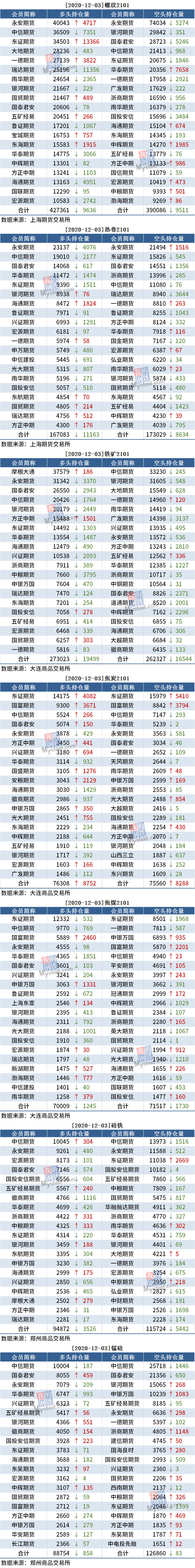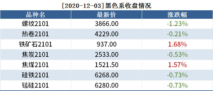 截至12月3日收盘,螺纹2101收3866,跌1.23%;热卷(4229, -9.00, -0.21%)2101收4229,跌0.21%;铁矿(937, 15.50, 1.68%)石2101收937,涨1.68%。各品种具体如下:
