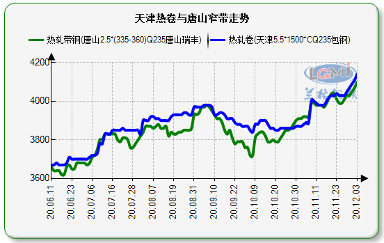 据兰格钢铁云商平台监测数据显示:无锡热轧带钢(2.5*355mm)中天4170元/吨,涨10元/吨,莱芜热轧带钢2.5*(232-355)莱钢4040元/吨,涨20元/吨。小窄带方面唐山国义、经安、首唐宝生、天物顺通等主流钢厂小窄带出厂价涨10元/吨,成交良好,基本出清日产,截至发稿报3960元/吨。今日带钢基本呈现不同程度上涨。