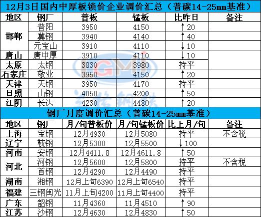 12月3日国内重点城市中厚板市场价格主稳个涨,据兰格云商平台监测数据显示,国内重点城市16-25mm普板平均价格为4036元,较上个成交日上涨7元,较上周同期上涨46元,较上月同期上涨123元。现主导城市方面,邯郸3940元,天津3930元,上涨10-30元,广州4310元,上海4100元,报稳。钢厂锁价方面,普阳3950元上调20元;唐中厚3910元下调10元;冀钢3940元上调40元;敬业3950元上调20元;山钢4050元上调50元;长达4230元上调20元;其余钢厂报价基本持平运行。