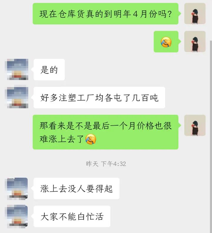 有人说这个行情,年底继续扛着吧,现在市场现状是原料上游猛涨价,代理商库存惜售,厂家打酱油,下游制品厂变相屯货,甚至转卖库存原料套现,价格短时间可能暂时涨不上去,因为下游制品厂屯的货可以用到明年4月份,甚至料已经堆到前台去了!江苏地区因为疫情原因部分厂家已经开始放假了!