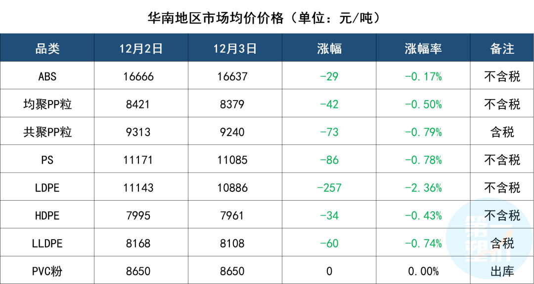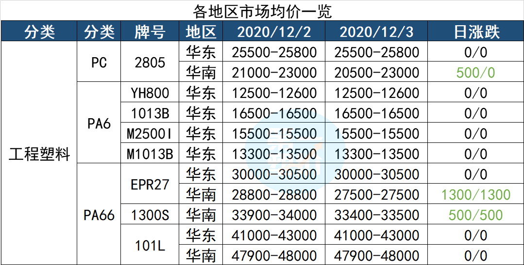今日市场价格普跌,PE、PP涨跌互现,PE跌50-1100元/吨,部分涨100-300,PP跌50-450元/吨,部分涨50-750元/吨,PA6部分涨50-200元/吨,ABS/PS继续下跌,跌幅在100-800元/吨,ABS,PC大跌100-900元/吨,个别涨100-400元/吨!
