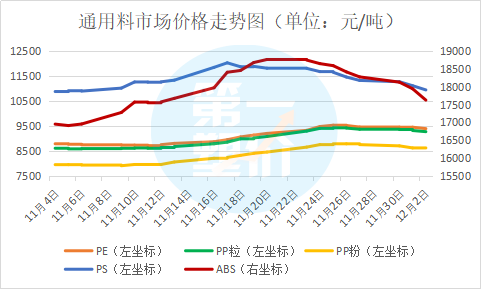 截止到到昨天,ABS均价已经跌17500元左右,跌幅超600元/吨,PS均价跌到10800左右,跌幅近500元/吨,PP拉丝料早已经从9000元掉到目前8500-8800元/吨,高压PE料最低也到了11000元/吨,好像目前处于稳定或者上涨的就只有PA及PVC品类了。之前那个红红火火飙涨的局面就像是幻觉,已经消失的无影无踪!现在也是一天一个价,但是和以往不同的是,现在每天是在下跌,有的人表示现在已经不赚钱了!