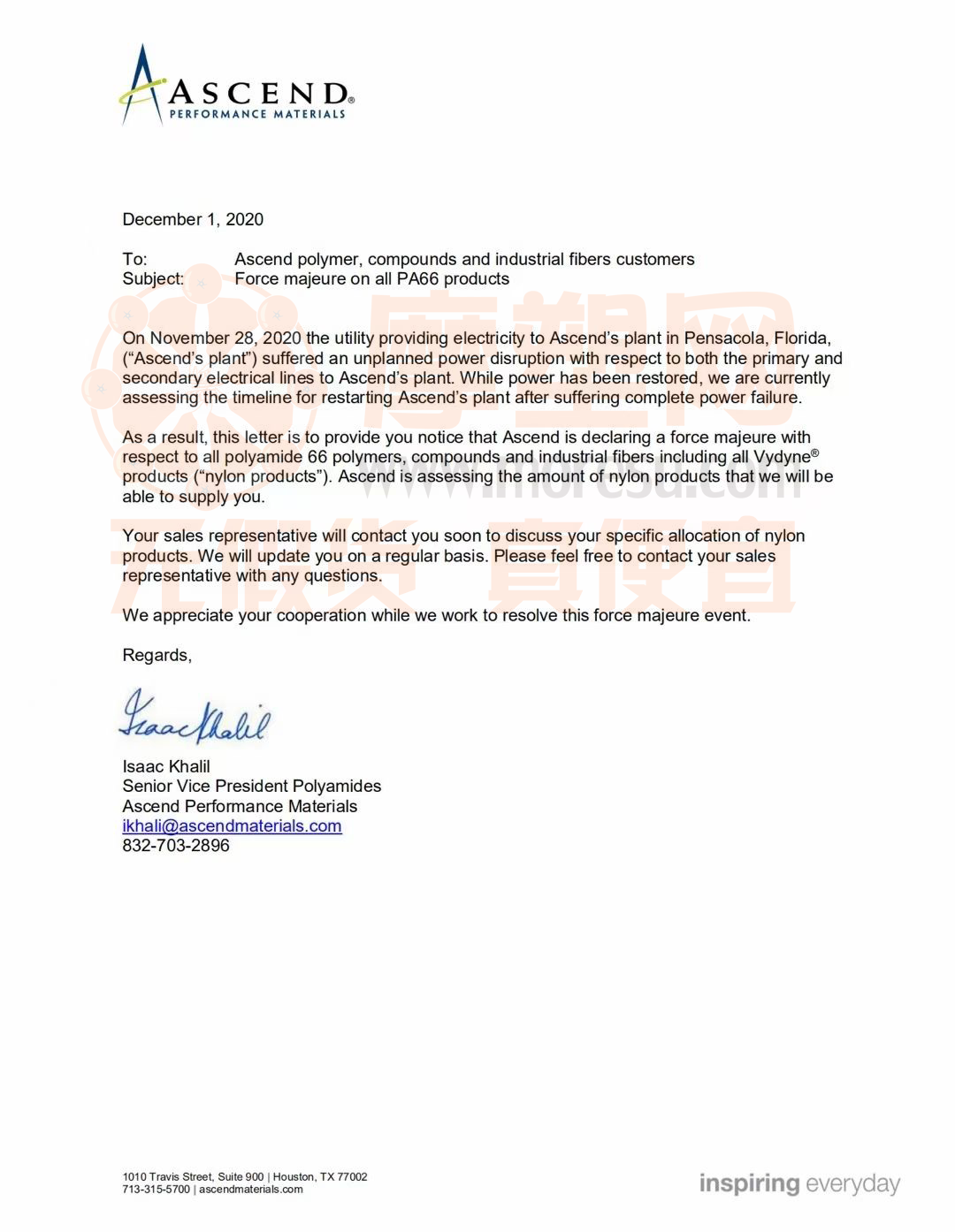 12月1日,奥升德公司宣布其位于佛罗里达州的彭萨科拉工厂遭受意外电力中断,此次不可抗力影响所有聚酰胺6,6聚合物、化合物和工业纤维。