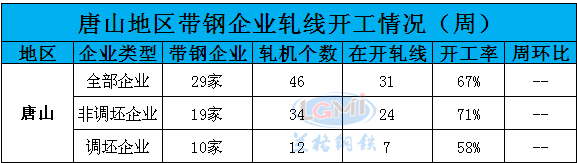据兰格云商调研监测:本周五(12月4日)兰格网对唐山地区29家带钢企业进行了开工情况调查,调查显示,唐山地区带钢轧机共有46个,在开工轧线31条,开工率为67%。