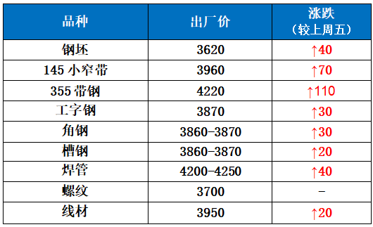 12月7日唐山钢坯直发价格报3620元/吨,较上周五涨40元/吨,仓储现货含税报3680-3690元/吨,现货市场情绪提振。唐山小窄带出厂价稳,基本出清日产。唐山型材价格继续走强,市场低价资源成交可,唐山地区建材市场价格以稳为主部分上涨,期螺走势强劲,然建材市场成交分化,部分受外围资源冲击。
