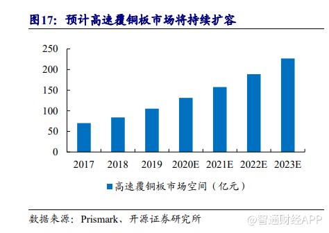 高速覆铜板方面,根据Prismark统计,2017年高速覆铜板市场规模仅70亿元,随着下游5G应用建设带来的数据流量增长,基站及服务器对高速覆铜板需求进一步攀升,开源证券预计在2023年高速覆铜板市场规模有望突破200亿元。