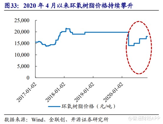 树脂方面,部分厂商因爆炸减产,环氧树脂价格已经由2020年4月的14000元/吨上涨至18000元/吨。