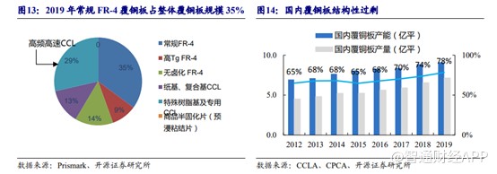 资料显示,覆铜板细分产品众多,国内厂商中低端覆铜板产品结构性过剩。根据Prismark统计,2019 年全球覆铜板市场销售额达到124亿美元,其中常规FR-4(玻纤布基材环氧树脂铜箔基板)覆铜板占比为35%。国内覆铜板低端产能供过于求,2019年国内覆铜板总体产能9.11亿平米和产量仅为7.14亿平米,整体产能利用率为78%,其中偏基础类的产品玻纤布基FR-4和CEM-3型覆铜板产能比重达到62.4%,而实际产量占比为57.2%,FR-4产能结构性过剩。