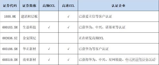 高频高速CCL方面,生益科技、华正新材和南亚新材的布局较全面,其中,生益科技的高频高速CCL等级更高,单位价值量更大;而华正新材和南亚新材则主要集中于低端的高频高速CCL。