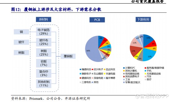 覆铜板材料上游涉及大宗商品,下游通过PCB产品供应各类电子终端。覆铜板上游原材料涉及铜、树脂、玻璃(1945, 84.00, 4.51%)布等,受到大宗商品价格影响,原材料价格波动对覆铜板行业的生产成本产生扰动,从原材料成本来看,电子铜箔、玻纤布、树脂的价格战覆铜板成本比例高达79%,涉及大宗商品价格;下游通过PCB产品供应至计算机、消费电子、汽车、工业类产品等终端产品。
