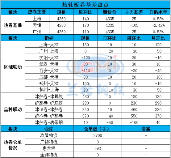 7日热卷区域联动价差:天津5.5mm普卷基价4230:上海价差130,乐从价差130