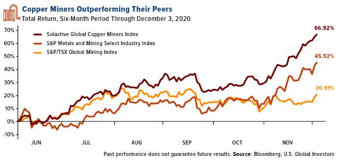 结果,铜生产商和探矿者的股价飙升。在截至12月3日的6个月里,Solactive Global Copper Miners Index的涨幅超过66%,超过了其他金属矿业集团的回报率。这一时期的表现受到Capstone Mining(上涨174.04%)等公司的推动,如在美国和墨西哥运营的Capstone Mining(上涨174.04%)、总部位于亚利桑那州的Freeport McMoRan(140.68%)和Ivanhoe Mines(93.93%),后者目前正在南非开发三个铜项目区。