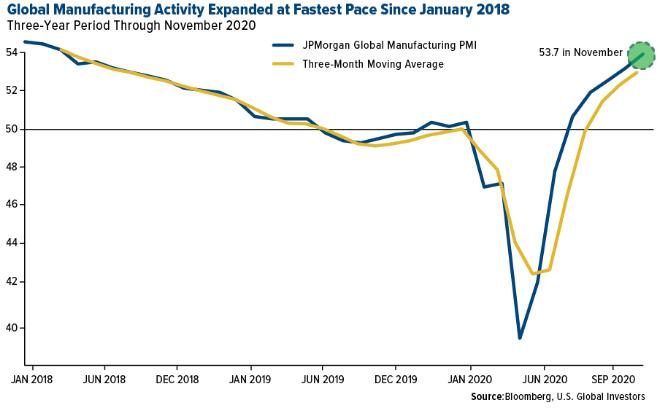 看看全球范围内的制造商,你可能不知道我们正处于一场大流行和经济倒退之中。摩根大通(JPMorgan)全球制造业PMI从10月份的53.0攀升至33个月高点53.7。摩根大通经济学家表示,这是自2018年1月以来的最快增速。