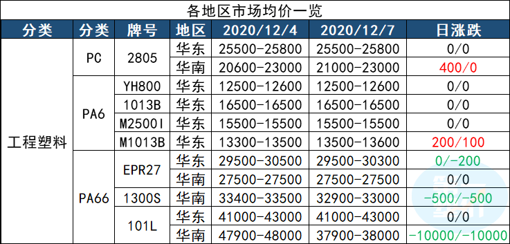 今日市场价格涨跌互现,PE、PP跌100-900元/吨,涨100-400,PA6涨跌100-300元/吨,ABS/PS涨跌互现,涨50-450元/吨,跌幅在100-750元/吨,ABS,PC跌100-500元/吨,部分涨200-1000元/吨,PA66跌200-500元/吨,其中101L单日下跌10000元/吨。