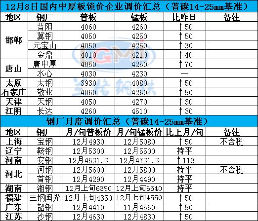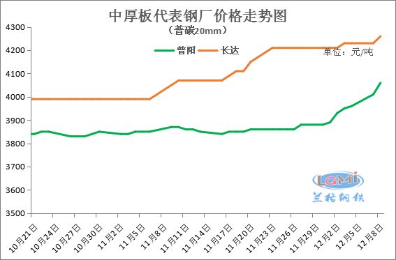 12月8日国内重点城市中厚板市场价格继续上涨,据兰格云商平台监测数据显示,国内重点城市16-25mm普板平均价格为4125元,较上个成交日上涨37元,较上周同期上涨118元,较上月同期上涨209元。现主导城市方面,邯郸4060元,天津4040元,广州4370元,上海4150元,涨幅在20-50元。钢厂锁价方面,普阳4060元,冀钢4050元,敬业4060元,太钢3930元,均上调50元;唐中厚4050元上调70元;元宝山4050元,天钢4050元,长达4260元,均上调30元;金鼎4010元上调40元;其余钢厂报价基本持平运行。