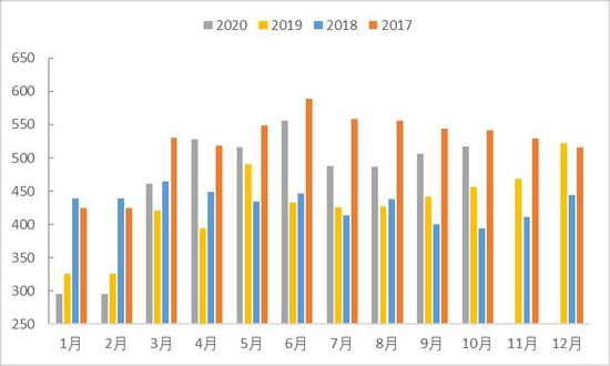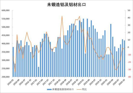 从出口方面的情况来看,10月未锻轧铝及铝材出口41.89万吨,较2019年同期下降2.58%。10月出口数据延续同比回落态势,且同比降幅走扩至十位数以上。环比正增长趋势也再度中断,环比下滑1.78个百分点。虽然三季度海外疫情发展较为平缓,但随着秋冬季气温的逐渐下降,部分外贸企业因担心疫情二次反扑而减少了海外工厂的订单量。并且在沪伦比值保持在高位的情况下,叠加人民币汇率的不断上升,10月铝材出口利润下滑明显,影响了部分出口企业的积极性。从11月的情况来看,在海外疫情持续高发的影响下,因报关效率的延缓,我们认为后续铝材出口量仍有继续下行的可能。
