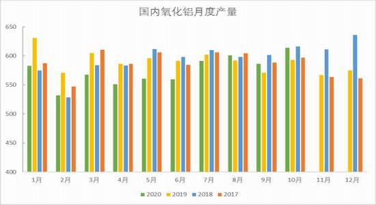 根据阿拉丁统计数据显示,10月国内氧化铝总产能8812万吨,运行产能7260万吨,开工率82.39%。国内10月氧化铝产量614万吨,日产量19.8万吨,日均产量较9月增加0.32万吨左右。10月海德鲁巴西氧化铝工厂减产造成的影响基本被市场消化,市场价格再度回到弱势震荡之中。伴随企业通过规模化生产降低成本诉求的增多,月内实际运行产能还在逆价格上涨之中,并对供应端产生更多压力。同时广西华昇以及魏桥沾化项目的陆续达产,也为月内产量做出贡献。不过东方希望旗下两家氧化铝企业满产不久后的提前检修,或对后续产量造成影响,但11月的产量情况仍有望保持正增长。
