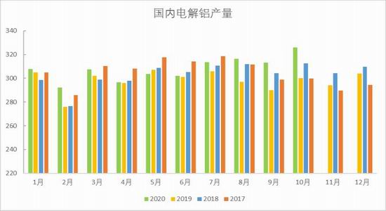 电解铝方面,根据阿拉丁统计数据显示,10月国内电解铝总产能4211.1万吨,运行产能3889.1万吨,开工率为92.35%。国内10月电解铝产量325.7万吨,日均产量10.5万吨,日均产量环比上升0.07万吨。10月受绝对铝价继续走高影响,在冶炼利润持续增厚的刺激下,企业投复产的进度继续加快。云南宏泰、云铝海鑫、广元林丰以及中铝华润四期等项目新增产能25万吨左右。青海百河、重庆国丰等项目的的集中复产也为月内产量带来增量。在铝冶炼利润创下近3年新高的情况下,11月的电解铝产量恐将接近322万吨。