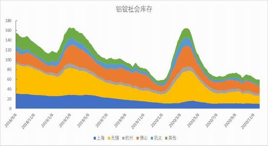 截止11月26日,LME铝库存为1383250吨,环比10月下降90650吨;国内主要地区铝锭社会库存合计61.1万吨,环比10月下降9万吨。11月国内库存在终端需求持续超预期的情况下,特别是出口订单的大幅增长,带来强劲的需求修复预期。在板带箔等需求持续向好的带动下,库存端的去化状态持续性较强。同时供应端虽然在高额生产利润的刺激下,产能运行水平增长较快。但在电力等不可抗力因素影响下,新增产能形成产量的节奏依旧较慢。在动态供需平衡仍处在短缺状态的情况下,面对强劲的表观需求,库存端的去化状态或将继续维持。