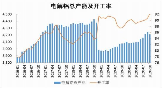 11月全球经济继续处在复苏之中,虽然欧美疫情仍未得到根本性控制,但随着疫苗研发进展的不断更新,海外经济受疫情的影响已经逐步减弱。同时美国大选结果的尘埃落定,也使得金融市场的风险偏好出现回升。在政策及地缘政治不确定性消除的乐观预期下,终端消费的持续复苏伴随各国制造业PMI指数的修复性上涨,均在推动有色金属需求的回升。同时美国新一轮刺激政策的提前落地也有抑制美元指数的可能,在宏观情绪与基本面共振走强的情况下,后续铝价仍有一定的上行基础。