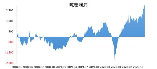 截止11月26日,按当日价格计算,电解铝企业冶炼平均完全成本约为12990元左右,较上月上涨约26元/吨。虽然11月受国内气温普遍下降影响,特别是在北方地区经历了大范围雨雪天气之后,冬季取暖需求的持续上升使得煤炭价格维持高位。同时在进口煤炭边际趋紧的情况下,因发电成本的小幅抬升使得工业电价存在上行预期。不过在地方财政政策的刺激下,年内电力成本变化几乎可以忽略不计。从辅料端的情况来看,11月国内阳极均价已回升至3416.8元/吨,较上月上涨约75元/吨;氟化铝价格也上涨至8250元/吨,较上月上涨约550元/吨。在与氧化铝价格此消彼长对冲之后,10月炼厂成本曲线还是出现了小幅上移。不过受月内绝对铝价涨至近3年高位影响,特别是在铝价突破16000元/吨整数关口之后,铝冶炼企业的利润水平创出2017年以来的新高。在高额生产利润的持续刺激下,供应端的增长趋势较为确定,伴随年底新增产能的不断释放,后续供应端或将面临较大的消化压力。同时需求端在季节性因素的影响下,或有周期性放缓的可能。伴随铝价上方空间的逐渐收窄,后续冶炼利润或有再度收窄的可能。