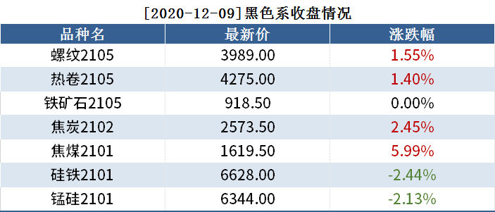 截至12月9日收盘,螺纹2105收3989,涨1.55%;热卷(4275, 59.00, 1.40%)2105收4275,涨1.40%;铁矿(919, 0.00, 0.00%)石2105收918.5,无涨跌。各品种具体如下: