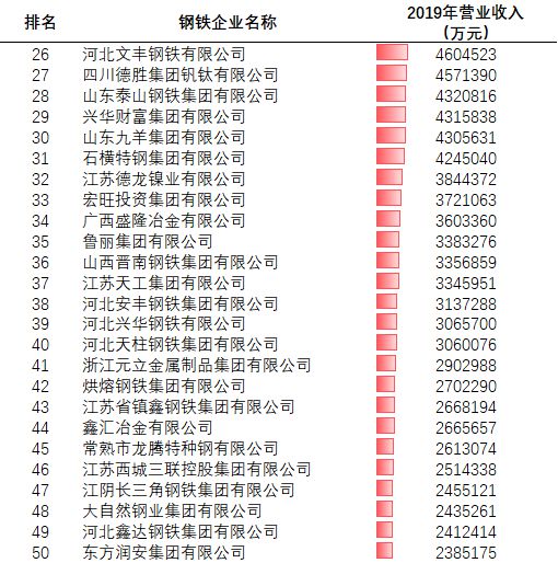 此外,江西第二大民营企业方大钢铁(12)、辽宁首富孙寿宽掌舵的嘉晨集团(21)等都榜上有名。作为钢铁大省,河北此次共有23家企业上榜,排名最靠前的是敬业集团(6),津西钢铁、新华联合冶金集团、普阳钢铁、金鼎钢铁、裕华钢铁、明芳钢铁、文安钢铁跻身前二十名。