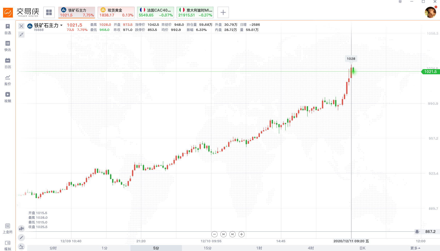 周五(12月11日)亚盘,铁矿石涨势延续,北京时间9:09,铁矿主力合约上破1000元关口,涨超5%,截至9:22,涨幅扩大至8%。