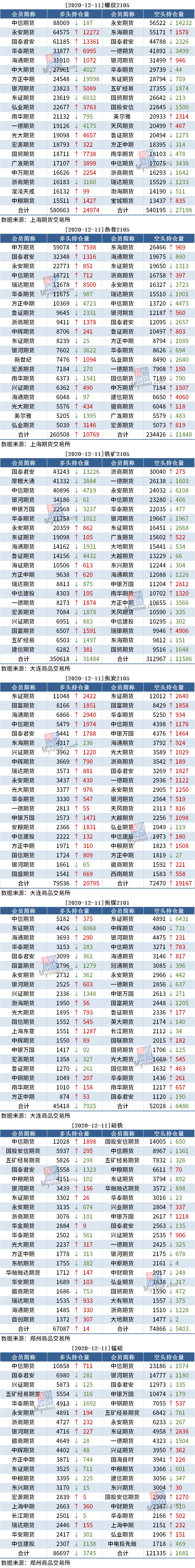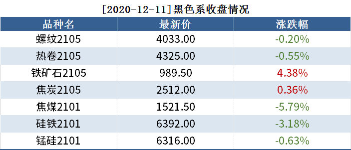 截至12月11日收盘,螺纹2105收4033,跌0.20%;热卷(4325, -24.00, -0.55%)2105收4325,跌0.55%;铁矿(990, 41.50, 4.38%)石2105收989.5,涨4.38%。各品种具体如下: